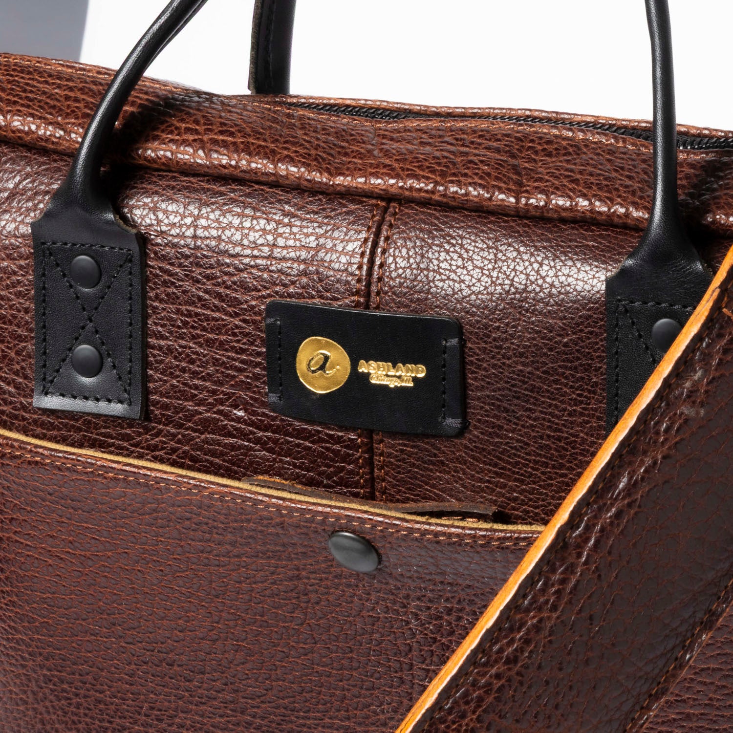 This sample briefcase exhibits subtle imperfections in its interior binding and stitching details.