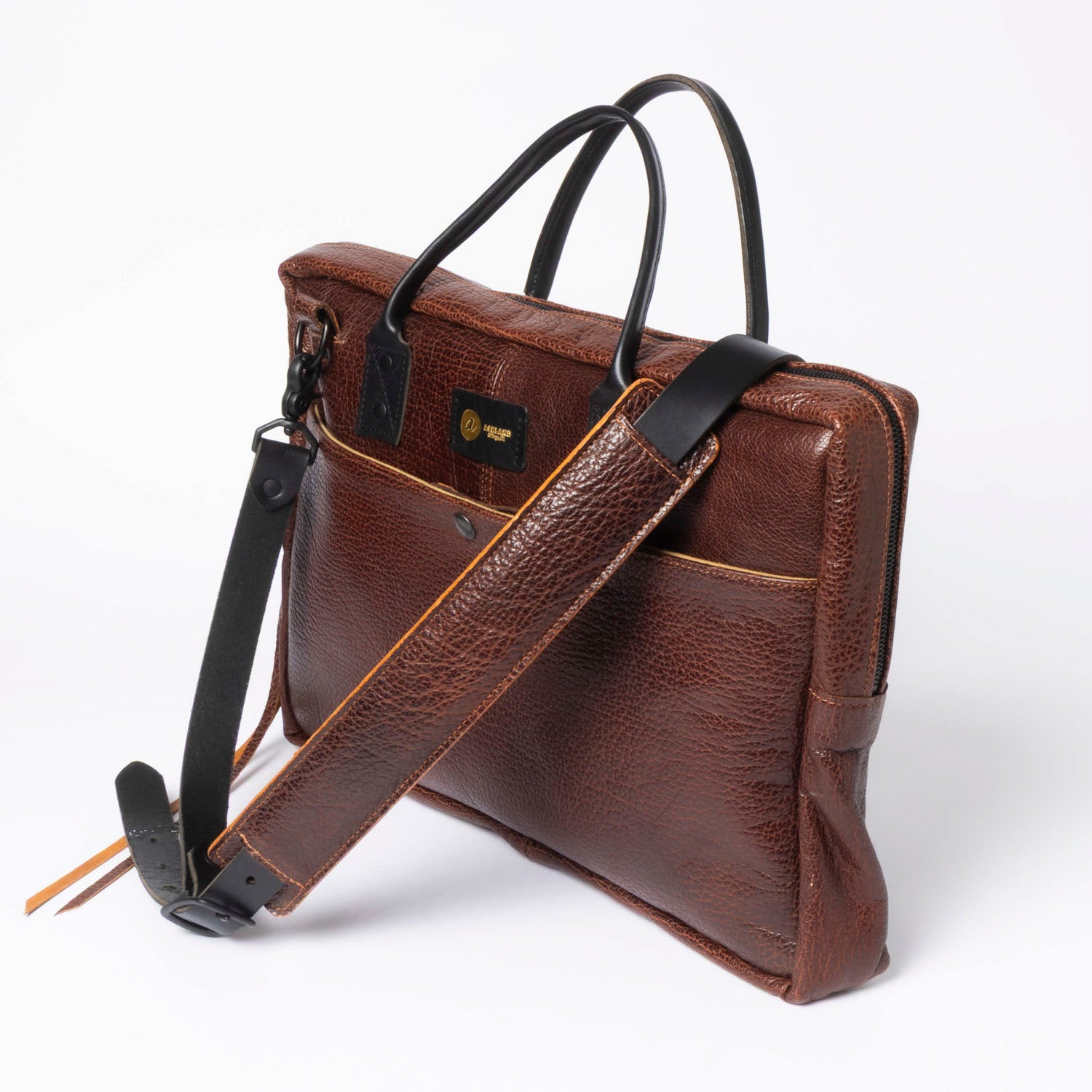 The Prototype Laptop Briefcase is crafted to securely hold and safeguard your daily essentials, including a 16" MacBook. It features a full-width exterior front pocket secured by a snap closure and a luggage strap on the back for easy transport. The interior boasts a canvas lining with leather trim and a raised false bottom laptop sleeve to protect your device from impact. Equipped with durable black Illini Latigo handles and a shoulder strap, the case’s body is constructed from premium Horween Bison leather.