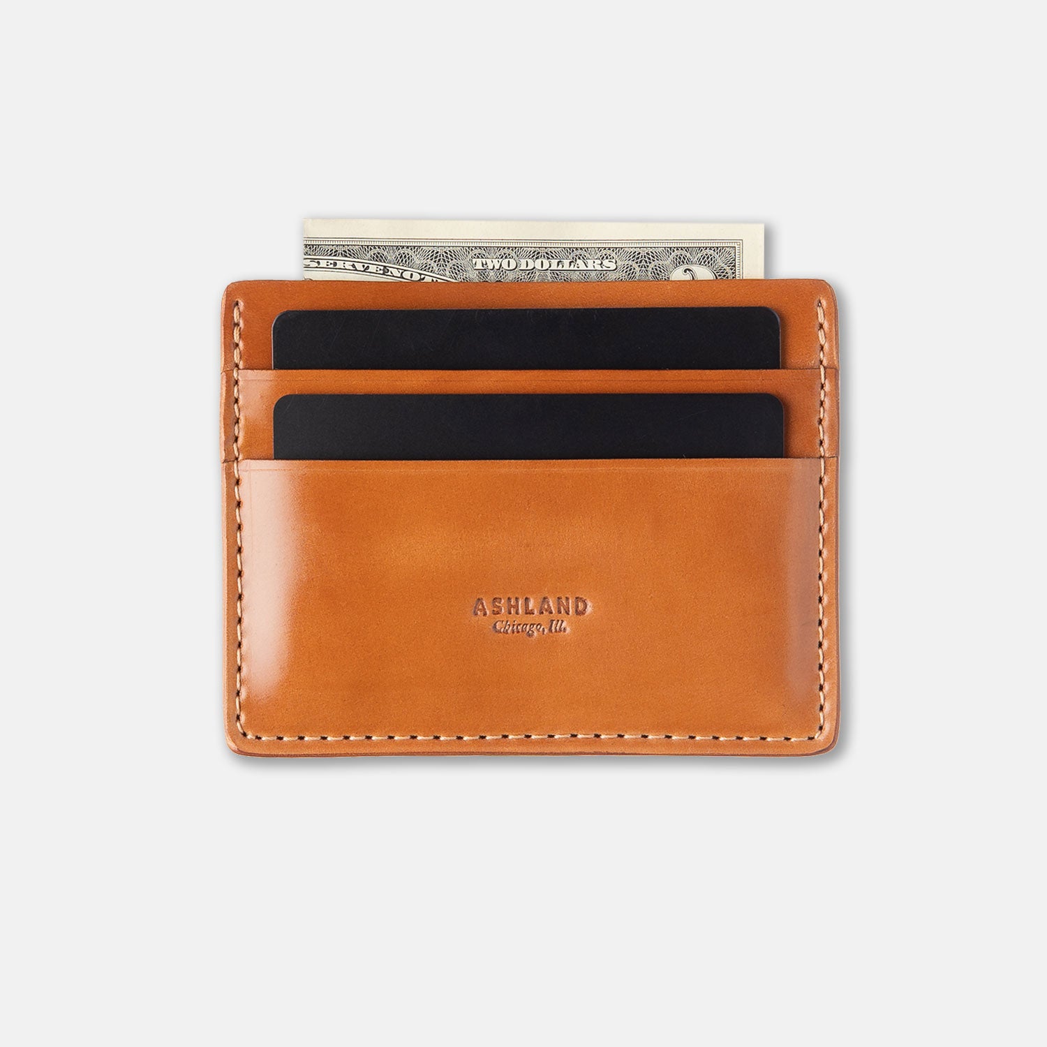 Frank the Enforcer is a sleek, minimalist leather card holder crafted in a timeless design. Expertly handmade in Chicago using premium genuine Horween® shell cordovan leather, it offers robust protection for your essential cards and accommodates a few folded bills in its spacious central slot.