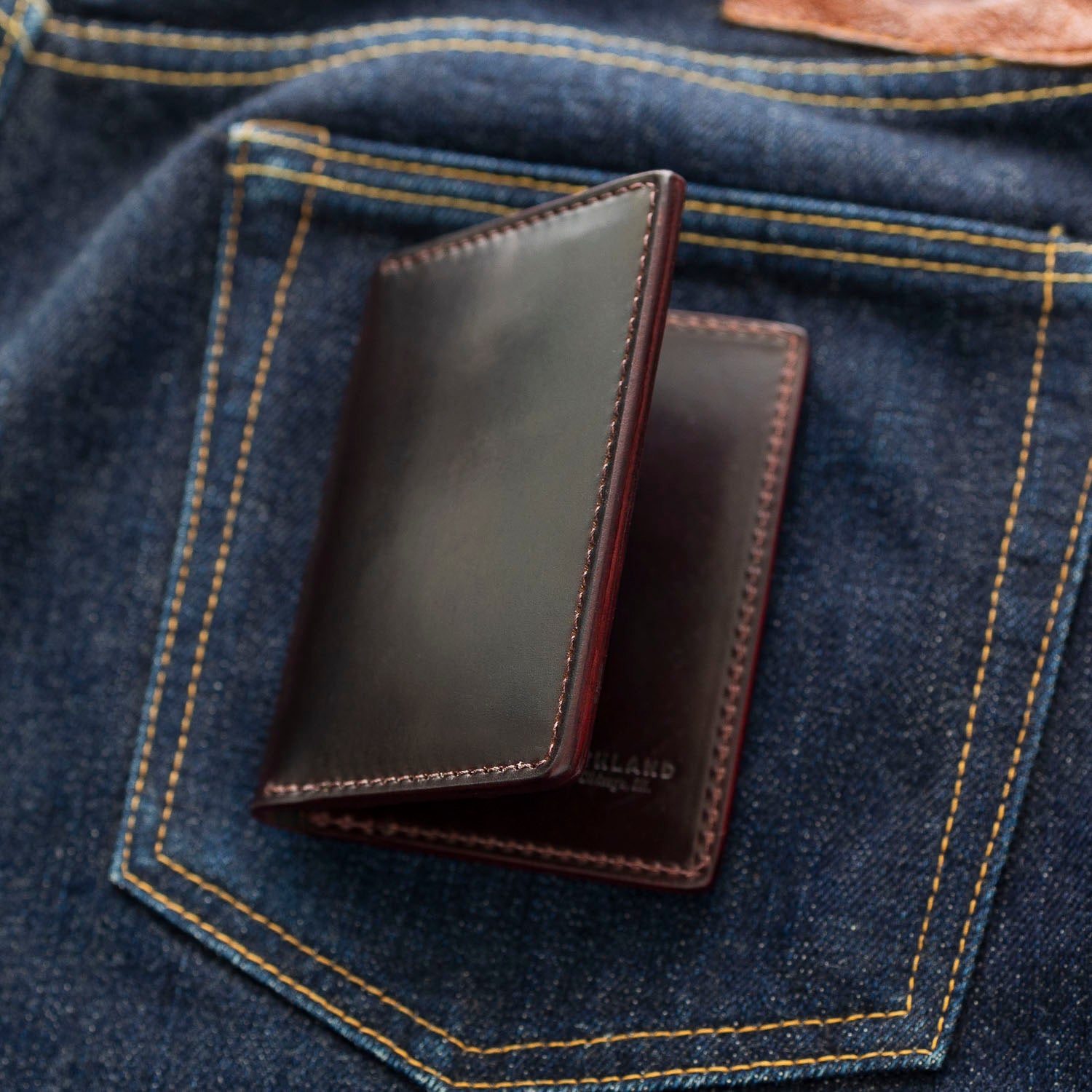 The Bugs Moran is a sleek shell cordovan wallet crafted for minimalism, suitable for carrying in either front or back pockets. Its streamlined design omits a dedicated bill compartment, yet it accommodates folded cash within the two larger card slots, maintaining a slim and efficient profile.